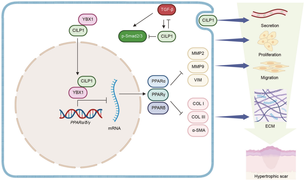 Wang JZ, Du J, Song YJ, et al. CILP1 interacting with YBX1 promotes hypertrophic scar formation by suppressing PPARs transcription. Cell Death Dis. 2025, 16(1):371. doi: 10.1038/s41419-025-07554-8