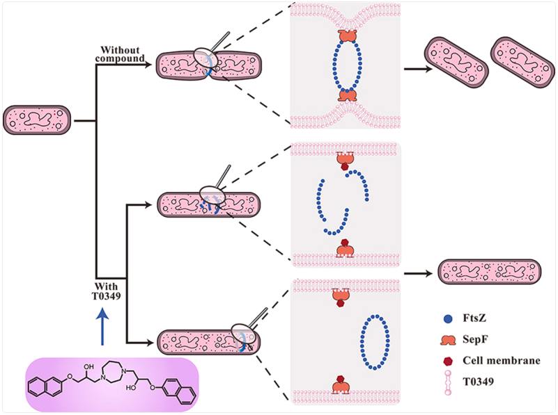 为了确定T0349是否会消除FtsZ/SepF相互作用,研究人员首先借助GST下拉实验,在大肠杆菌中纯化GST-FtsZ与GST蛋白,以GST-FtsZ为诱饵证实FtsZ与SepF 的强相互作用(仅GST-FtsZ可下拉到His-SepF),后续加入不同浓度T0349孵育,通过Western blot发现His-SepF下拉量呈剂量依赖性降低,而GST-FtsZ不受影响,证明T0349可破坏二者结合;接着采用FP技术(分析蛋白互作的定量技术),合成FITC 标记的FtsZ关键互作区域肽段(FITC-FtsZ,363-379aa),纯化SepF的FtsZ互作区域片段(SepFc,115-203aa),以50 nmol/L FITC-FtsZ为探针检测到FtsZ与SepFc互作的Kd为18.57 nmol/L,加入T0349后其对二者互作的抑制呈剂量依赖性,IC50为 20.42 μmol/L;最后运用SPR技术(精准定量分子结合的技术),将His-FtsZ、His-SepF分别包被CM5传感芯片,测得FtsZ与SepF互作的KD为1.13 μmol/L,FtsZ与 SepFc互作的KD为5.16 μmol/L,进一步检测T0349的结合靶点发现,其可结合SepF(KD=47.7 μmol/L)与SepFc(KD=46.75 μmol/L),但不结合FtsZ,所有技术结果共同证实:T0349通过结合SepF 的C端互作区域(SepFc),破坏FtsZ/SepF的相互作用。