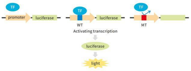 利用荧光素酶与底物结合发生化学发光反应的特性,把感兴趣的基因转录的调控元件克隆在萤火虫荧光素酶基因的上/下游,构建成荧光素酶报告质粒。然后转染细胞,适当刺激或处理后裂解细胞,测定荧光素酶活性。通过荧光素酶活性的高低判断刺激前后或不同刺激对感兴趣的调控元件的影响,常应用于miRNA靶基因验证及启动子转录活性调控等方向研究。
