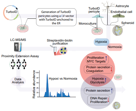 研究者通过TurboID的实验技术手段,捕获并富集源自与人内皮细胞和星形胶质细胞共培养的球体内人脑周细胞的分泌蛋白,结合质谱和多重免疫测定,确定了不同处理条件下周细胞分泌的蛋白质。