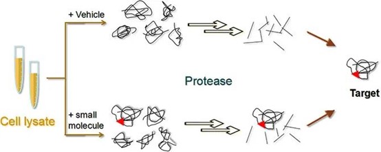 小分子配体(药物/天然产物)与靶蛋白特异性结合,通过非共价相互作用稳定蛋白三维构象,显著提升其对链霉蛋白酶的水解抗性。将细胞/组织总蛋白裂解液分为药物处理组与对照组(DMSO),在相同条件下进行有限酶解;未结合配体的蛋白易被降解,结合配体的靶蛋白则保留更多完整片段。通过 SDS-PAGE 分离酶解产物,对比两组条带差异,切取差异条带进行定量质谱(Label-free、DIA 模式),鉴定丰度显著升高的蛋白(即药物潜在靶点)。